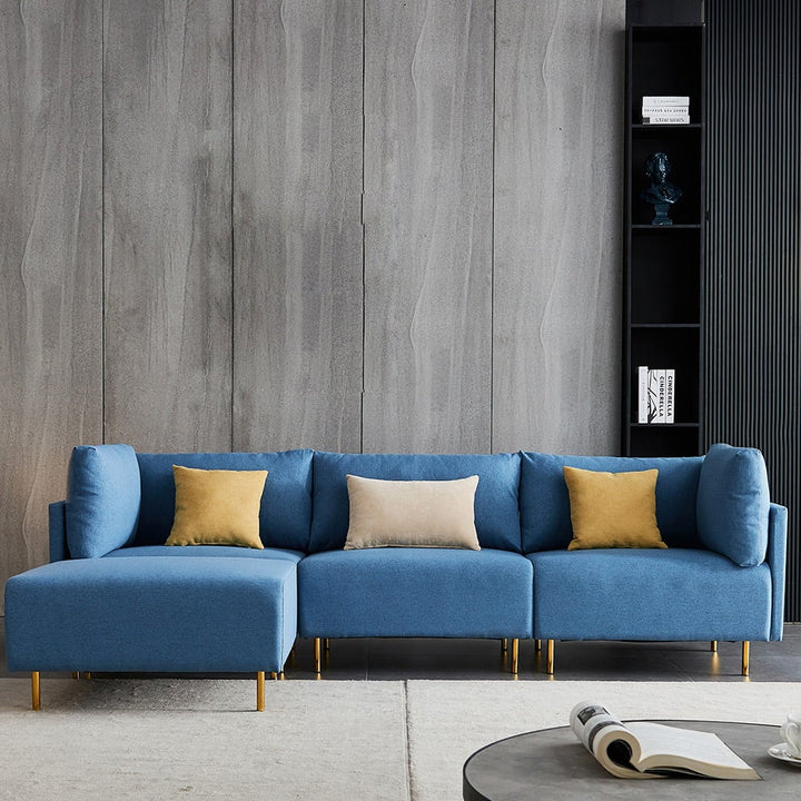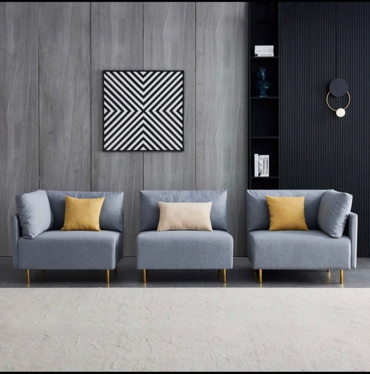 اريكة استرخاء ثلاثية عصرية بتصميم أنيق، مصنوعة من خامات عالية الجودة مثل الخشب الصلب والمعدن والقماش الناعم. تتميز بألوان متناسقة مع أى قطعة أثاث بالمنزل حيث تم توفيرها باللون الأزرق و البيج و الرمادى .