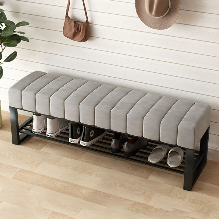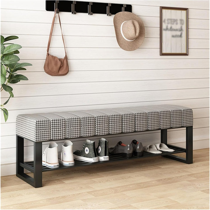 بانكيت عصرى و عملى كما انه تصميمه المميز أتاح له وضعه بأى غرفه بالمنزل سواء كانت غرفة النوم أو غرفة المعيشه او مدخل المنزل . يتميز المقعد بإطار معدني أسود قوي مع مقعد مبطن في الأعلى، ومبطن بقماش بنمط رائع، مما يوفر خيار جلوس مريح. يوجد أسفل المقعد رف معدني يعمل كمساحة تخزين، ويحمل عدة أزواج من الأحذية منظمة بشكل أنيق.
