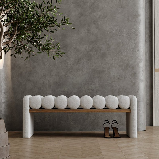 "أضف لمسة من المرح الفني والأناقة المعاصرة إلى مدخلك، غرفة معيشتك، أو غرفة نومك مع هذا البانكيت الفريد، تحفة تصميم تجمع بين الراحة الجذابة والجمالية المبتكرة. يتميز البانكيت بصف من كرات منفوشة وناعمة مغطاة بقماش البوكليه الفاخر ، مما يوفر تجربة جلوس مريحة ومميزة. تستقر هذه الكرات على قاعدة خشبية دافئة، وتدعمها أرجل سميكة بتصميم عصري مغطاة بنفس قماش البوكليه، مما يخلق توازنًا بصريًا رائعًا بين المواد والأشكال. تصميم هذا البانكيت لا يجعله مجرد مقعد وظيفي، بل قطعة فنية تضيف طابعًا شخصيًا ولمسة من الدفء والأناقة غير التقليدية إلى أي مساحة. استخدمه كمقعد أنيق عند المدخل، أو كإضافة مميزة لغرفة المعيشة أو غرفة النوم، واستمتع بالراحة والتصميم الذي يلفت الأنظار.