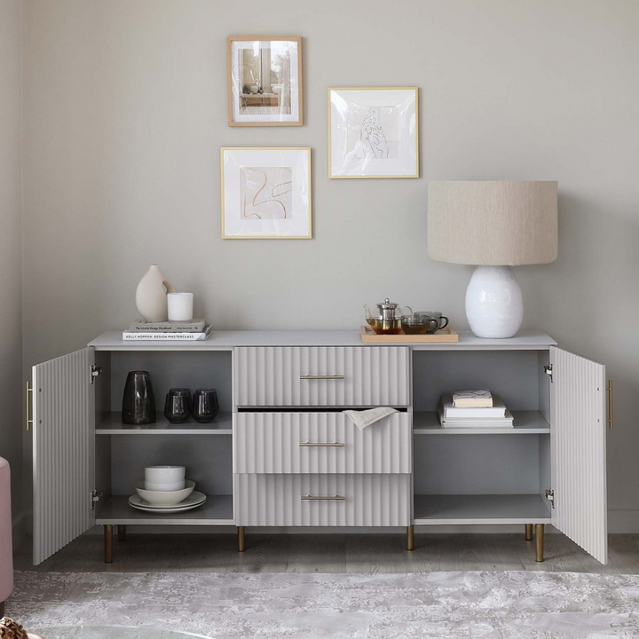 يتميز هذا البوفيه بإضفاء لمسه من الأناقه على أي غرفه بالمنزل سواء كان غرفة الطعام أو غرفة المعيشه . بفضل تفاصيلها المميزه و تداخل اللون الذهبى مع الرمادى الفاتحه منحها رونقاً خاص بها . كما أنها من الناحيه العمليه فهى تمتاز بمساحه داخليه واسعه مع أستخدام أجود انواع الخشب فى تصنيعها ..