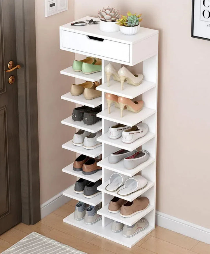 خزانه احذيه من عدة ارفف من الواح خشب mdf المعروف عنه جودته العاليه و شدة صلابته و هي متوفره ب اكثر من لون يمكنك الاختيار بينهم و هما ( ابيض - بنى ) و مقاس و احد مناسب لجميع المساحات الكبيره و الصغيره و هو ( ارتفاع 125 سم و عرض 40 سم و عمق 22 سم )