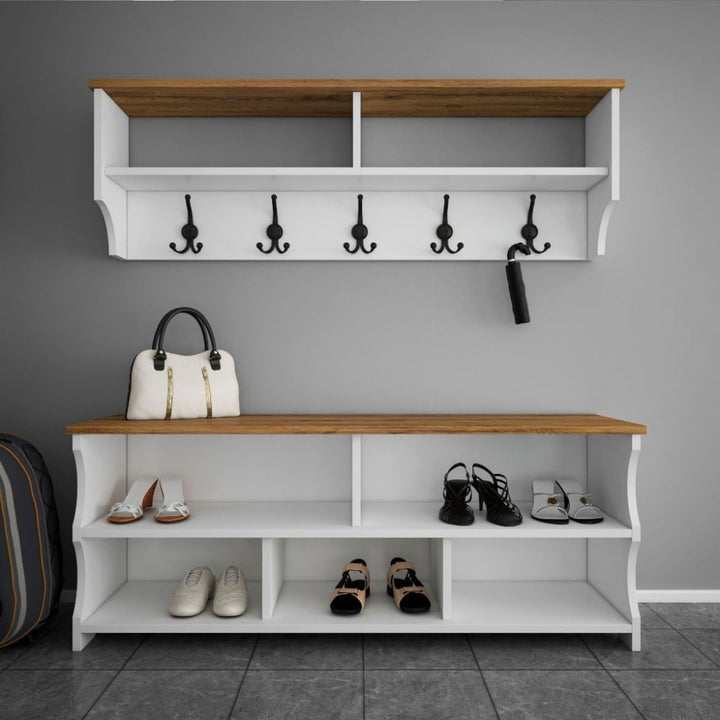 خزانة مدخل أنيقه تتكون من قطعتين رف علوى لتعليق الملابس و المعاطف و رف سفلى للأحذيه و مقعد للجلوس . الخزانة تم تصنيعها من ألواح خشب mdf المعروف عنه جودته العاليه . تأتى باللون الأبيض و يمكنك و ضعها في أى غرفه بالمنزل .