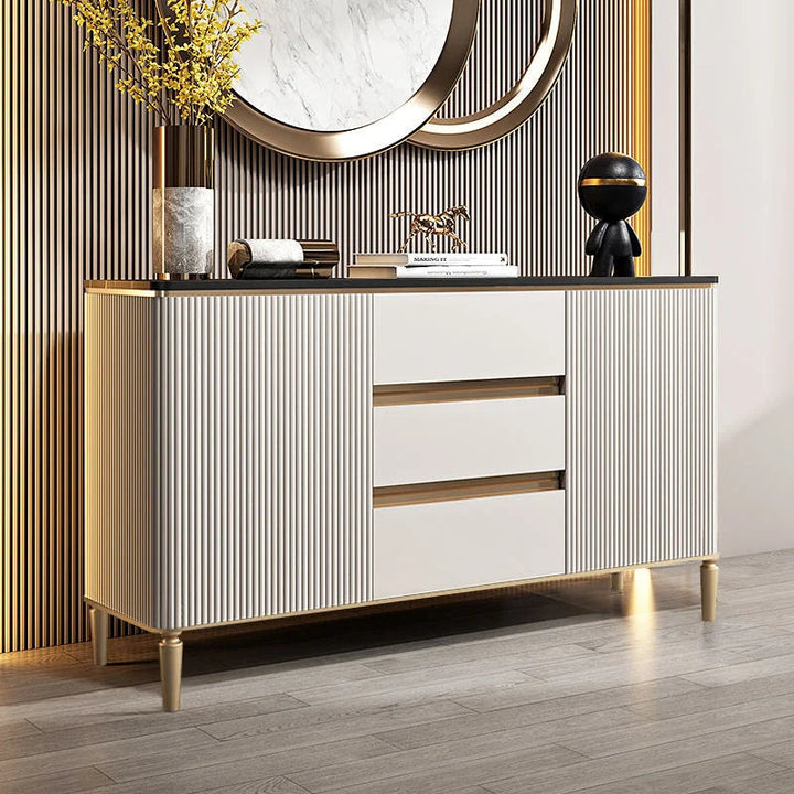 بوفيه بتصميم كلاسيكى فاخر . يأتى التصميم بمقاسات مثاليه لوضعها بإى غرفه بالمنزل حيث تبلغ من الارتفاع 80 سم و عرض 120 سم و عمق 40 سم . يتم تصنيع البوفيه من مجموعه من المواد ذات جوده عاليه مثل الخشب حيث تم أستخدامه فى الهيكل الأساسى فى البوفيه و الأستانلس ستيل فى تصنيع الارجل حتى تدعمه و تساعد على ثبات و أستقرار البوفيه و سطح من بديل الرخام يأتي البوفية بتصميم يجمع بين البيج والذهبي ، تلك الألوان تعزز الطابع الكلاسيكى والأناقة للبوفية وتتناسب مع معظم ألوان الديكور الداخلي.