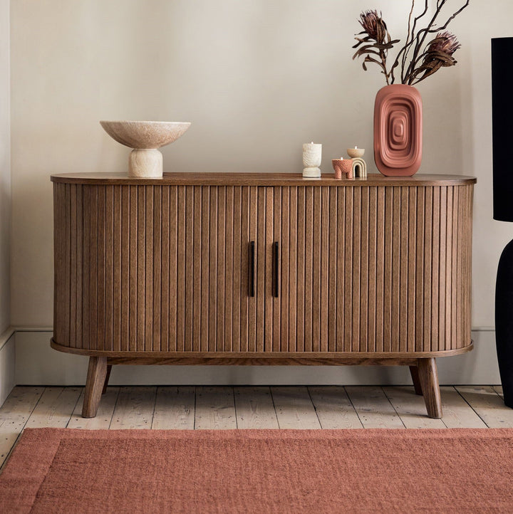 تم تصميم الخزانه الجانبيه بتصميمها الدافئ بلونها البنى الذي يمتزج بسلاسه إلى ديكورات المنزل الحديثه و الكلاسيكيه . خزانه جانبيه ذات نمط دار لتعزيز أثاث المنزل الخاص بك . و تضمن الأبعاد المناسبه وضعها بأى غرفه بالمنزل حيث تبلغ من العرض 119 سم - العمق 57 سم - الارتفاع 80 سم . مما يجعلها مثاليه لأى منطقة معيشه. حافظ على المساحة الخاصة بك منظمة وخالية من الفوضى مع التصميم المبتكر الذي يضم بابين منزلقين ورفين داخليين.