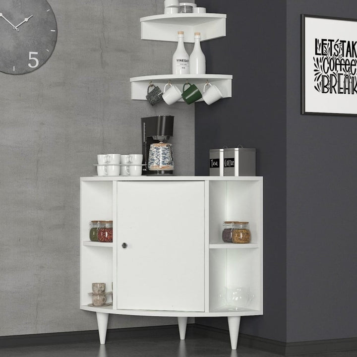 اذا كنت من عشاق القهوة فانت بالتاكيد من انصار تصميم ركن خاص للقهوة في منزلك اصبح ركن القهوة في الاونة الاخيرة من الاجزاء المهمة في كل منزل لما يضفيه من لمسة تجميلية وتنظيمية، فمع انه لا يشغل حيز كبير الا انه يجمع كل ما يخص القهوة من اواني والات في مكان واحد بطريقة جميلة ومرتبة فيسهل الوصول اليها دون عناء الان وفرنا لك هذا التصميم الجميل: وحدة تخزين سفلية مع عدد 2 من الرفوف يناسب اي زاوية في البيت لون ابيض يتناسب مع اي لون اخر للديكور