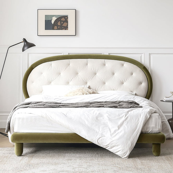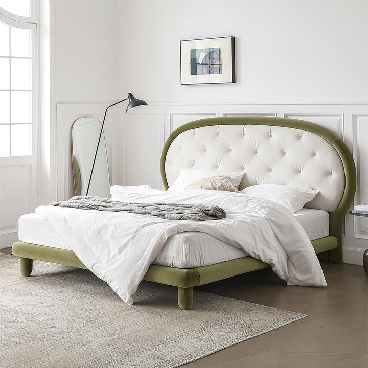 سرير أنيق وفاخر بتصميم عصري وجذاب، يتميز بظهره الكبير المنحني والمبطن بطبقة من القماش الناعم ذو اللون الهادئ ، والذي يضفي لمسة من الدفء والرقي على الغرفة. يأتي بإطار من المخمل الأخضر الهادئ، مما يجعله قطعة فريدة تلفت الأنظار وتتكامل بسلاسة مع ديكور أي غرفة نوم. يتميز السرير بأرجل دائرية تعزز من ثباته وتضيف لمسة جمالية أنيقة. مثالي لإضفاء لمسة من الفخامة والراحة على مساحة النوم