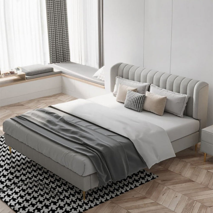 سرير غرف نوم بتصميم بسيط مصنوع من اجود خامات القماش و الخشب الصلب و متاح باللون الرمادي الفاتح والرمادي الغامق والوردي و متوفر بمقاس ارتفاع 113 سم و عرض 182/152 سم و عمق 218 سم و يمكن استخدامها في المنزل و الفنادق