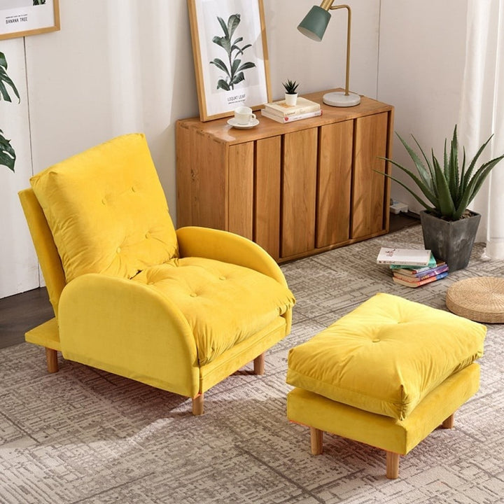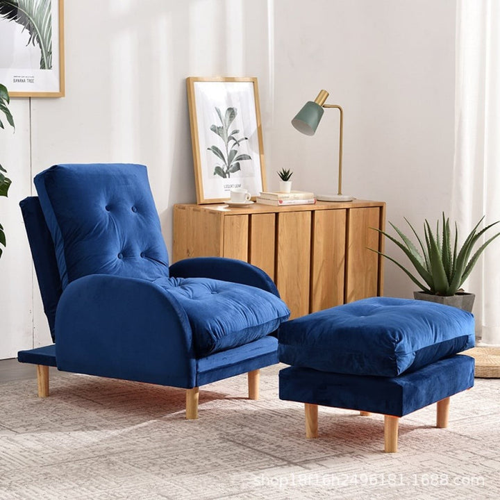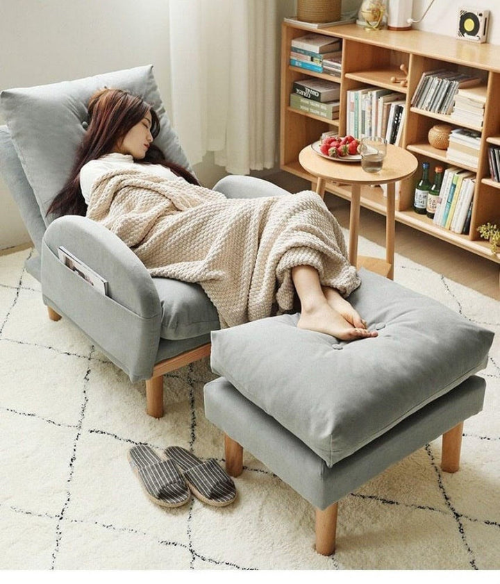 كرسي للاسترخاء بمسند ظهر قابل للثني. هيكل المقعد كاملاً من الخشب الصلب مغطى باسفنج عالي الكثافة قابل للارتداد، ومُنجَّد قماش من المخمل عالي الجودة مقاوم للاهتراء ناعم الملمس، يرتكز هيكل المقعد على أرجل خشبية متينة شديدة التحمل. المنتج متاح بعدة ألوان (الرمادي، الأزرق، الأصفر)، ومتوفر بمقاس واحد فقط للمقعد ومسند القدمين. كرسي الاستلقاء سيكون هو المكان المثالي للاسترخاء بعد يوم طويل.