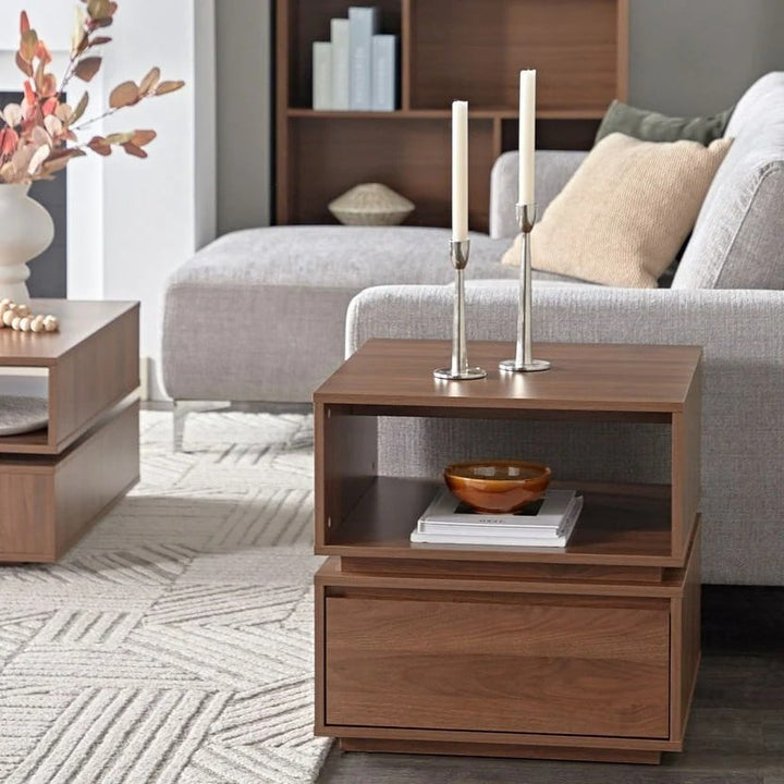 طاولة جانبية بسيطة وأنيقة. تتناسب مع أي ديكور منزلي. مصنوعة من مواد عالية الجودة. متينة وقابلة للاستخدام لسنوات عديدة. يمكن استخدامها كطاولة جانبية في غرفة المعيشة أو غرفة النوم. يمكن استخدامها لوضع المشروبات أو الكتب أو الديكورات. يمكن استخدامها كطاولة قهوة صغيرة. تتميز بسطح ناعم و سهل التنظيف و رف مفتوح للخلف لسهولة تخزين الاشياء طويلة الحجم . و بها درج تخزيني سفلى بمساحة كبيرة لتخزين جميع الادوات و الاغراض . و تأتى بمقاس ارتفاع 55 سم و عرض 55 سم . و تأتي بلون خشبى بنى .