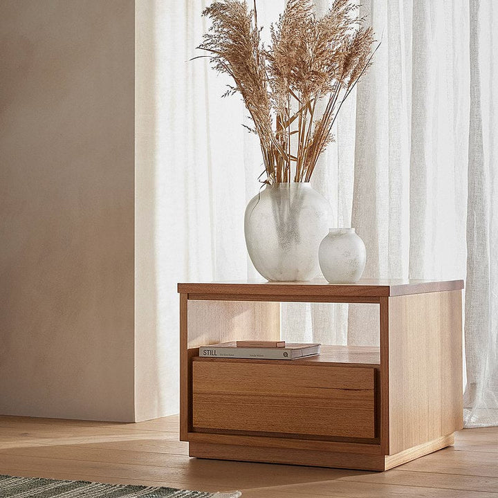 طاولة جانبية خشبية بتصميم أنيق وبسيط، مثالية لإضافة لمسة طبيعية ودافئة إلى غرفة نومك أو أي مساحة في منزلك. تتميز برف علوي مفتوح لتخزين الكتب أو الديكورات، ودرج واسع مزود بآلية انزلاق سلسة لحفظ مقتنياتك الشخصية بأمان. مصنوعة من خشب عالي الجودة لضمان المتانة والاستدامة