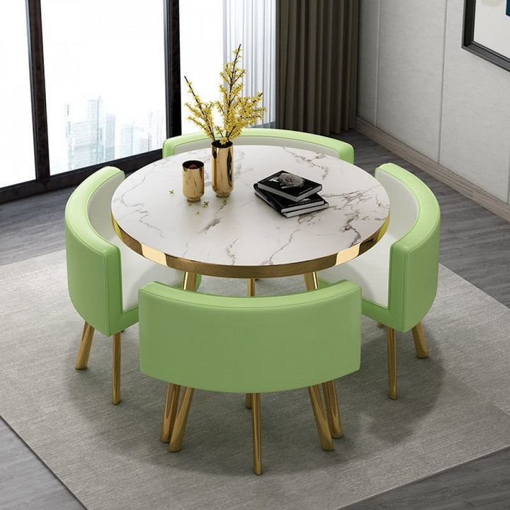 أضف نمطًا عصريا مع طاولة الطعام المستديرة هذه , حيث تربط بين الموضة والآداء بتصميمها الرائع وبقرص خشبي بنمط رخامي , هيكل معدن , بالإضافة الى كرسي جلد أنيق حيث توفر مكانًا رائعًا لمشاركة وجبة مع أحد أفراد أسرتك. و متوفره بعدة الوان مييزه يتيح لك الاختيار بينهم و مقاس ( الطاولة الدائرية : 90*75 سم - الكرسي : 63*73 سم )