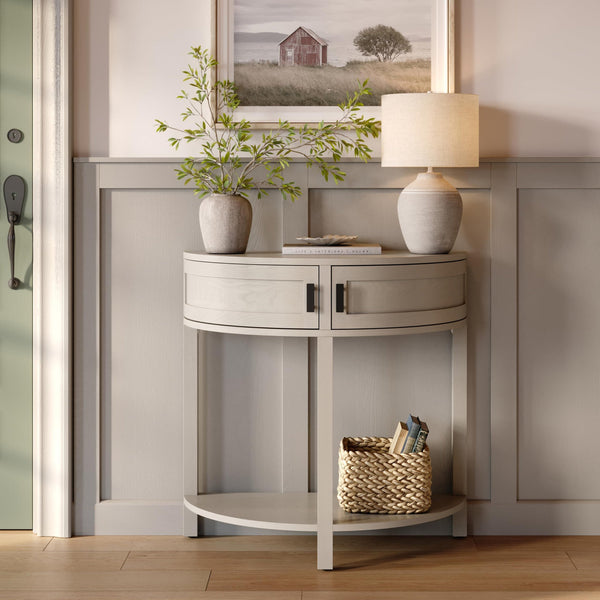 أضف لمسة راقية لمنزلك مع هذه الطاولة الكونسول الخشبية الأنيقة، التي تتميز بتصميم نصف دائري يجمع بين البساطة والفخامة، مما يجعلها مثالية للمدخل، الممرات، أو أي زاوية تحتاج إلى لمسة ديكورية مميزة. مصنوعة من خشب عالي الجودة لضمان المتانة والثبات، وتأتي مع درجين أنيقين لتخزين المستلزمات الصغيرة، بالإضافة إلى رف سفلي يتيح لك عرض الديكورات . تصميمها العملي يناسب جميع المساحات، مما يجعلها قطعة مثالية تجمع بين الجمال والوظيفة في منزلك