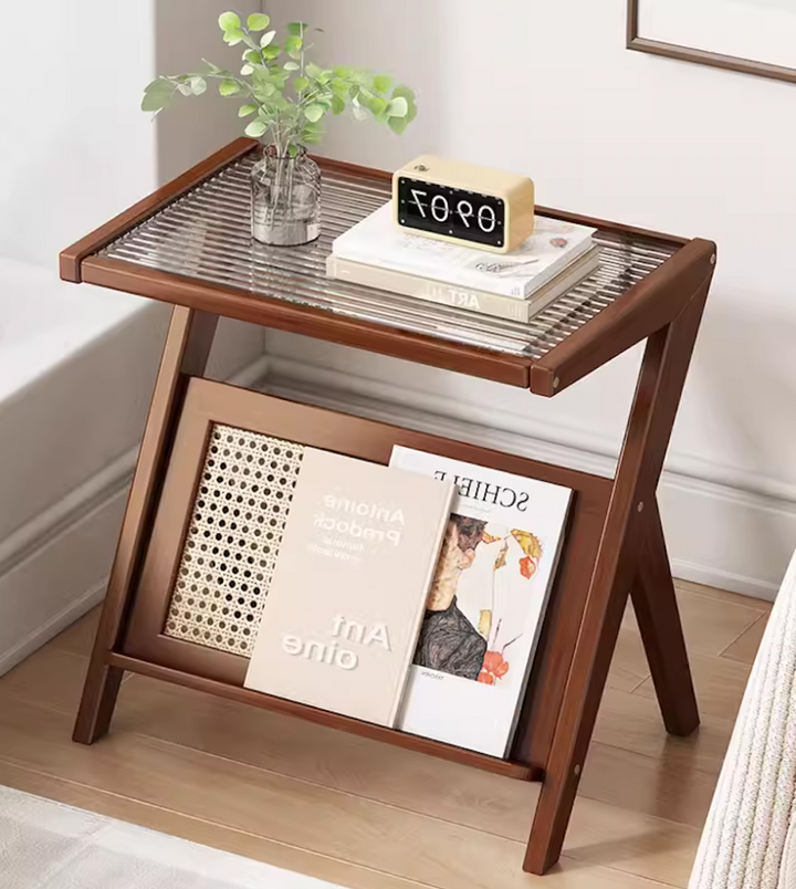 طاولة جانبية خشبية حديثة مصنوعه من اجود خامات الاخشاب, يتميز سطح الطاولة بصنعة من الزجاج كما يتميز هيكلها بخشب الروطان المعروف بجودته و صلابته و هي ايضاً متوفره ب اللون ( الخشبي - البني ) و مقاس ( ارتفاع 56 سم و عرض 45 سم و عمق 37 سم )