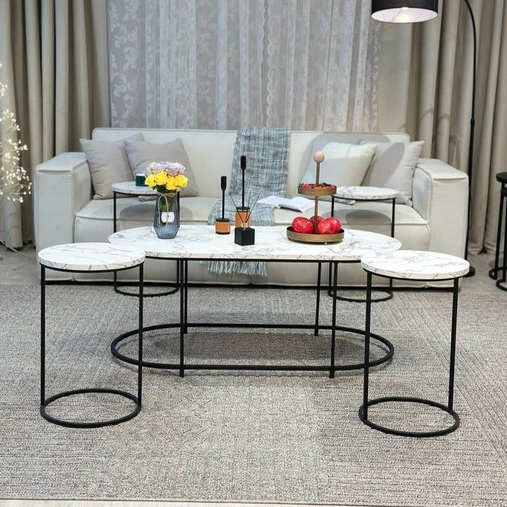 ارتقِ بمساحتك المعيشية إلى مستوى جديد من الرقي والعملية مع هذه المجموعة المتكاملة من طاولات القهوة والخدمة. بتصميمها الفريد الذي يمزج بين أناقة الرخام الأبيض والقواعد المعدنية السوداء، تُعد هذه المجموعة إضافة مثالية لأي منزل يسعى للجمال العصري والوظائف المتعددة