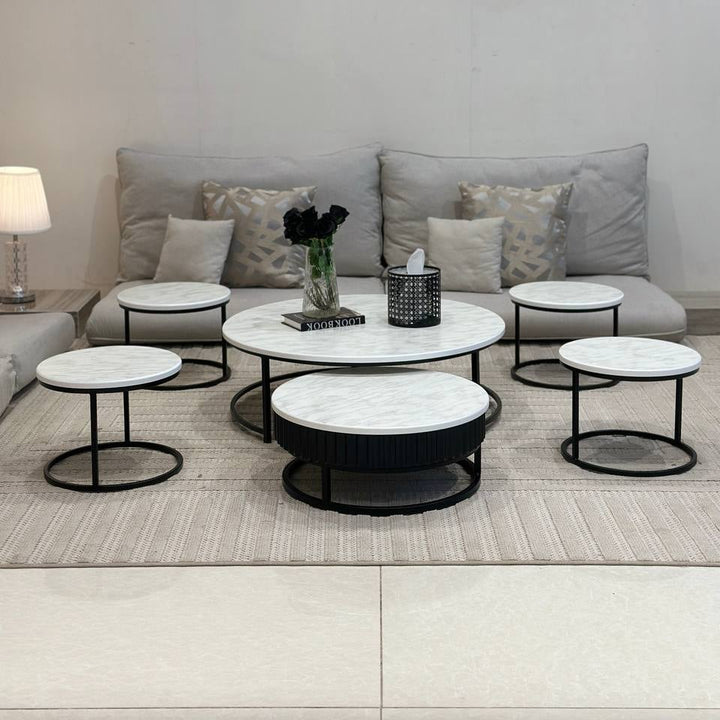 استمتع بتجربة استضافة راقية ومريحة مع طقم طاولات متكامل، المصمم ليجمع بين الأناقة العصرية والوظائف المتعددة. هذا الطقم الشامل مثالي للمساحات الكبيرة والصغيرة، ويوفر حلولًا مرنة لتلبية جميع احتياجاتك في غرفة المعيشة