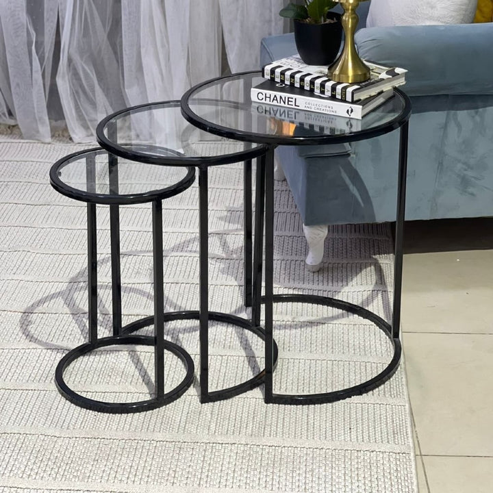 ارتقِ بمستوى أناقة ووظائف مساحتك مع طقم الطاولات المتداخلة الفاخر هذا، المكون من 3 قطع بتصميم يجمع بين الأناقة العصرية والعملية المطلقة يتميز الطقم بتصميم دائري أنيق ينسجم مع مختلف الديكورات، من المودرن إلى الصناعي. اللون الأسود الكلاسيكي للإطار يضفي لمسة من الرقي والجرأة