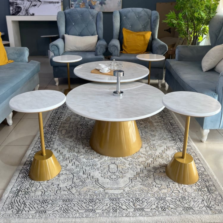 طقم طاولات دائرية مع 4 خدمات تصميم دائري سطح رخامي أبيض وقواعد ذهبية يتميز مظهر هذا الطقم بتصميمه الفاخر والعصري، حيث يوفر لك إضافة فخامة وأناقة لأي مساحة داخلية. هذا الطقم هو خيار مثالي لأولئك الذين يبحثون عن منتج يجمع بين الأناقة والجودة. يمكن استخدامه في غرفة المعيشة أو غرفة الطعام أو أي مكان آخر تحتاج إلى لمسة فاخرة.إضافة رائعة إلى أثاثك المنزلي و سيجذب أنظار الجميع بأناقته اللافتة.