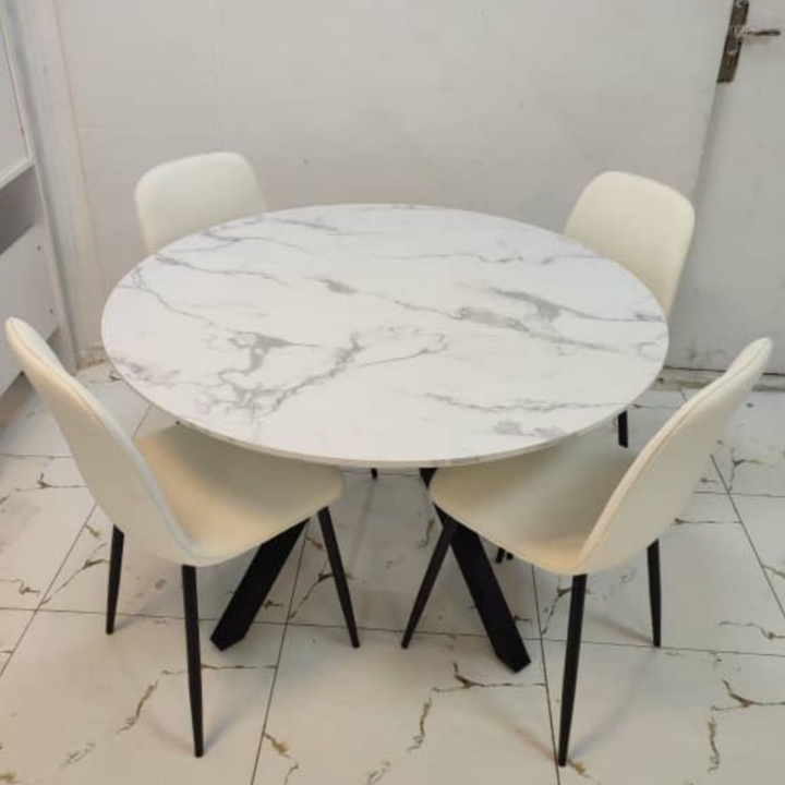 عززى من أناقه قطع الأثاث بالمنزل . و احصلى عى طاولة طعام دائريه يأتى حولها 4 كراسى جلديه حتى تساع 4 افراد . سطح الطاوله يأتى من الخشب الصلب الذى يتحمل معك درجات الحراره العاليه و يتميز بسهوله التنظيف . مع ارجل من المعدن المقاوم للصدأ . كما انه تم أختيار اللون الابيض الدافئ و مقاس ( ارتفاع 78 سم * عرض 100 سم * عمق 100 سم ) .