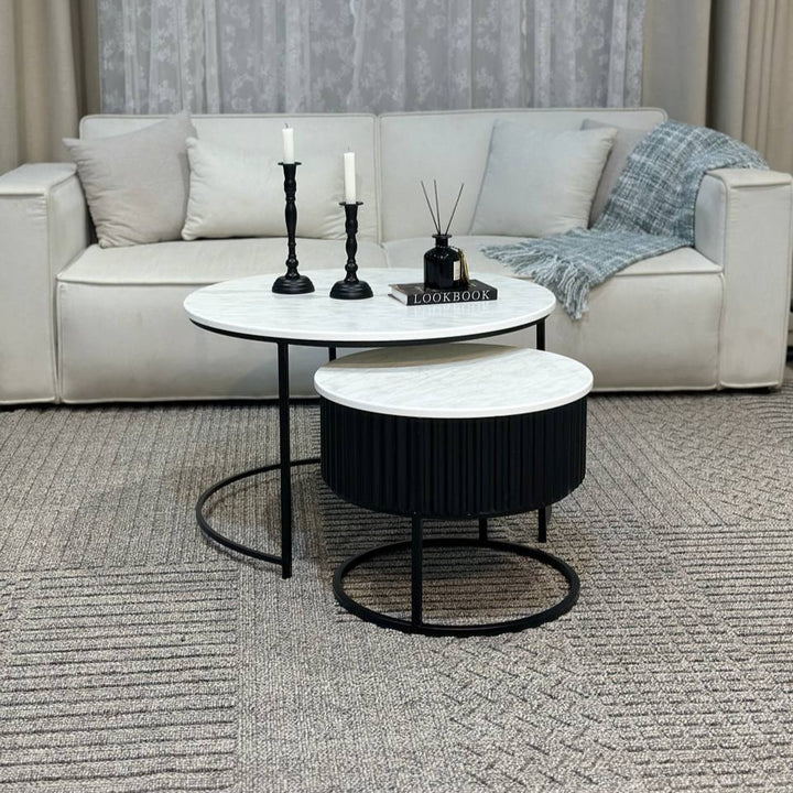 اكتشف الفخامة والعملية مع طقم طاولات القهوة المتداخل هذا، المصمم ليضفي لمسة من الرقي الحديث إلى قلب مساحتك المعيشية. يجمع هذا الطقم بين الأناقة الخالدة واللمسات العصرية الجريئة، ليصبح نقطة محورية جذابة وعملية في منزلك