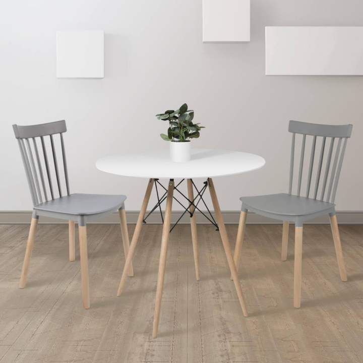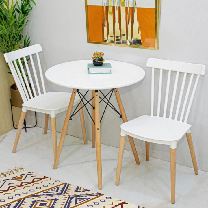 طاولة طعام مؤلف من طاوله دائريه مع كرسيين مصنوعان من أجود الخامات الخشبيه الرائعه . يمكنك أستخدامها فى عدة أماكن منها غرفة الطعام او الجلسات الخارجيه فى الحديقه . كما أنها تأتى بلونين مختلفين منها الرمادى و الابيض و مقاس واحد ارتفاع 70 سم * عرض 60 سم .