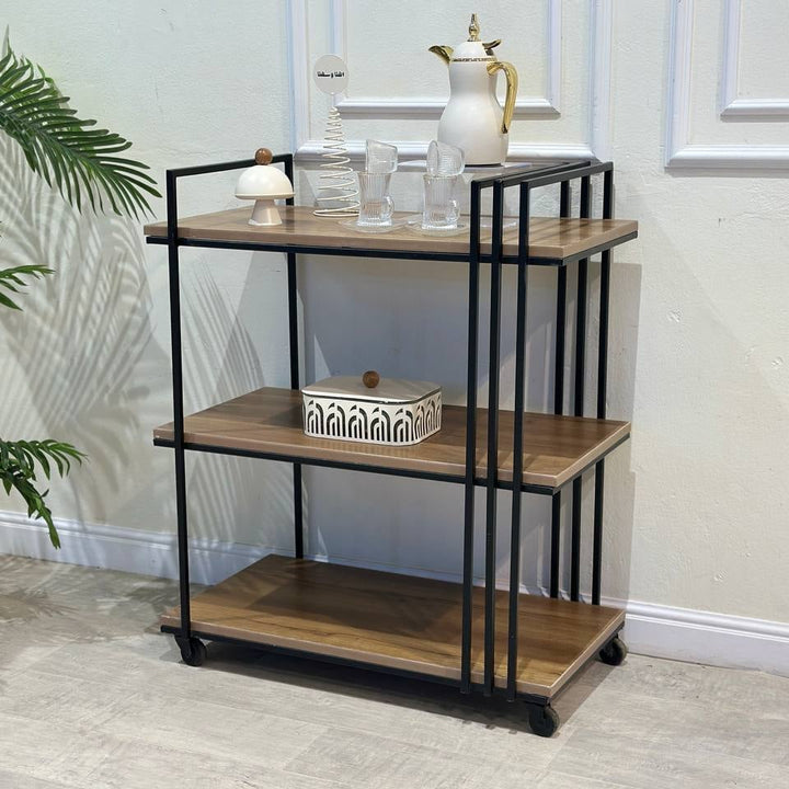 أضف لمسة من الأناقة الصناعية والوظائف المتعددة إلى منزلك مع هذه العربة العملية ذات الثلاثة رفوف، المصممة لتوفر لك مساحة تخزين وتنظيم فريدة بلمسة جمالية مميزة . تتميز العربة بتصميم يمزج بين دفء الأرفف الخشبية الأنيقة ومتانة الإطار المعدني الأسود ذي الخطوط الجريئة. هذا التباين يخلق مظهرًا صناعيًا عصريًا ينسجم مع مختلف الديكورات.
