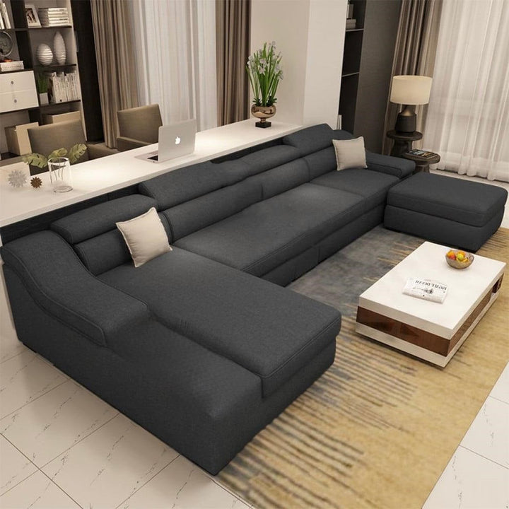أريكة مودرن على شكل حرف L عالية الجودة ، مصنوعة من قماش كتان و حشو إسفنجي عالي الكثافة ، إطار خشبي داخلي ، تحتوي علي طاولة من الخشب الثقيل ، رف يستخدم في التخزين او عرض بعض الكريستالات او الديكورات ، و يوجد بها شازلونج يمكنك استخدامه كسرير للاسترخاء , متوفر بالوان متعددة ( الرمادي - الكحلي - البني - البيج ) ، تأني بمقاس ( العرض 310 سم - العمق 180 سم * ارتفاع 85 سم )