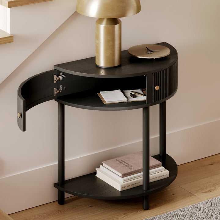 أضف لمسة أنيقة ومميزة إلى منزلك مع هذا الكونسول النصف دائري المصمم ليتناسب مع مختلف المساحات. يتميز بتصميم عملي يضم وحدة تخزين مغلقة للحفاظ على مقتنياتك بأناقة، بالإضافة إلى رفوف مفتوحة مثالية لعرض الديكورات والكتب. مصنوع من خامات عالية الجودة مع لمسات نهائية راقية باللون الأسود الفاخر، مما يجعله قطعة فنية تدمج بين الجمال والوظيفة. مثالي للمداخل، غرف المعيشة أو حتى زوايا المنزل، لإضافة لمسة راقية وعصرية بكل بساطة