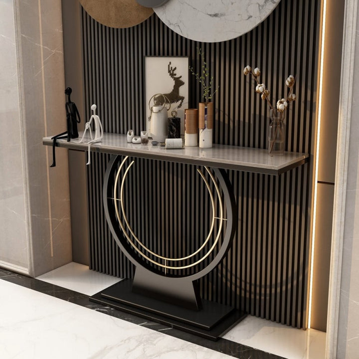 هذه الكونسول الحديثة ذات القاعدة المعدنية الدائرية مثالية لإضافة الأناقة إلى أي ديكور منزلي. تضيف الحلقات المعدنية المدمجة عنصر تصميم فريدًا من شأنه أن يدلي ببيان في أي غرفة. إنه الحجم المثالي ليناسب معظم المساحات، ويضمن بنائه القوي سنوات من الاستخدام. أضف هذه القطعة إلى غرفة المعيشة أو الردهة الخاصة بك