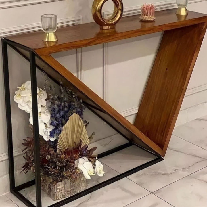 الابداع في التصميم، العصرية، التميز والفخامة هي أفضل المصطلحات لوصف طاولة المدخل هذه التي تتميز بتصميم بشكل مثلثين متعاكسين الأول مصنوع من الخشب ليشكل الجزء العلوي والثاني من الحديد المقاوم للصدأ ليشكل القاعدة، من خلال اختيار الديكورات المناسبة مثل مراكن الزرع أو اباجورة عصرية وبعض قطع الكريستال سوف تحصلين على طاولة مدخل تجذب انظار الضيوف لفخامة ورقي اختياراتك.