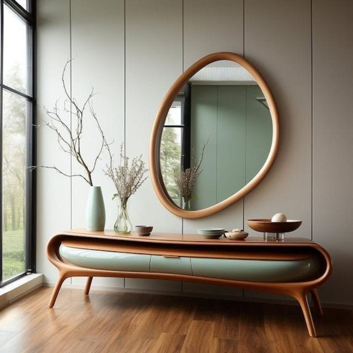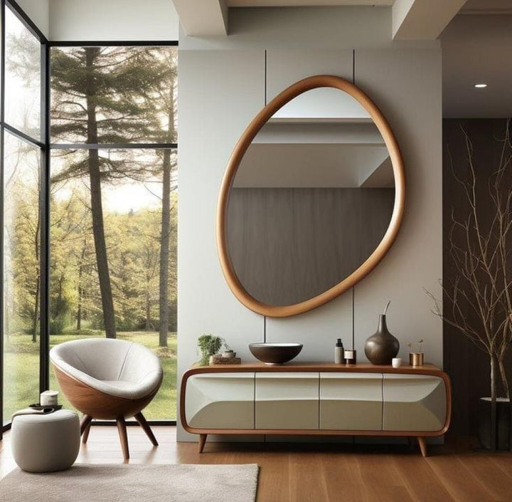 أضف لمسة من الفن والإبداع إلى مساحتك مع هذه المرأة الاستثنائية. إطارها الخشبي الأنيق يمنحها شكلاً بيضاويًا انسيابيًا يضفي على أي غرفة عمقًا وإشراقة لا مثيل لهما. إنها ليست مجرد مرأة لتعكس صورتك، بل تحفة فنية مصممة لتكون مركز الاهتمام، وتمنحك إحساسًا بالهدوء والتوازن. اجعلها قطعة أساسية في مدخل منزلك أو غرفة المعيشة، ودع جمالها يتحدث عن ذوقك الفريد.
