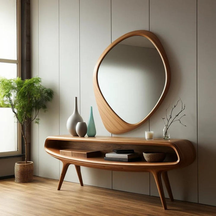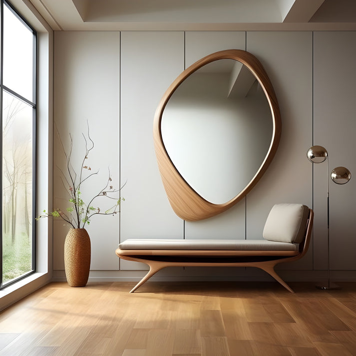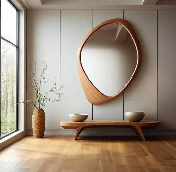 أضف لمسة من الفن إلى مساحتك مع هذه المرأة ذات التصميم الفريد. إطارها الخشبي الأنيق يمنحها شكلًا انسيابيًا يضفي على أي غرفة عمقًا وإشراقة لا مثيل لهما. ليست مجرد مرأة، بل قطعة فنية مصممة لتكون مركز الاهتمام في مساحتك الخاصة. اجعليها انعكاسًا لذوقك الرفيع