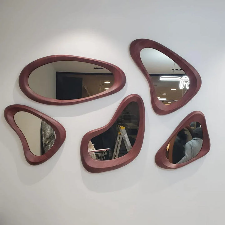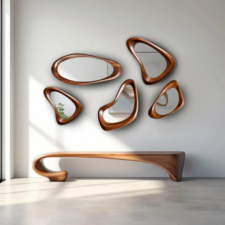 أضف لمسة من الفن والإبداع إلى جدرانك مع مجموعة المرايا هذه. كل مرآة في هذه المجموعة هي قطعة فنية فريدة، تتميز بإطار خشبي أنيق ، مستوحى من جمال الطبيعة والأشكال السائلة. يمكنك ترتيب هذه المرايا بخيالك الخاص لإنشاء لوحة فنية جدارية ، تعكس الضوء وتوسع المساحة، مضيفةً عمقًا وإشراقة لا مثيل لهما. إنها ليست مجرد مرايا، بل تحف فنية حقيقية تضفي شخصية وأناقة على أي غرفة، وتعبر عن ذوقك الرفيع والمميز