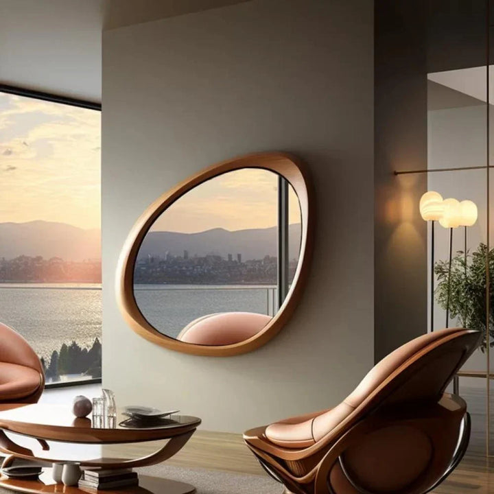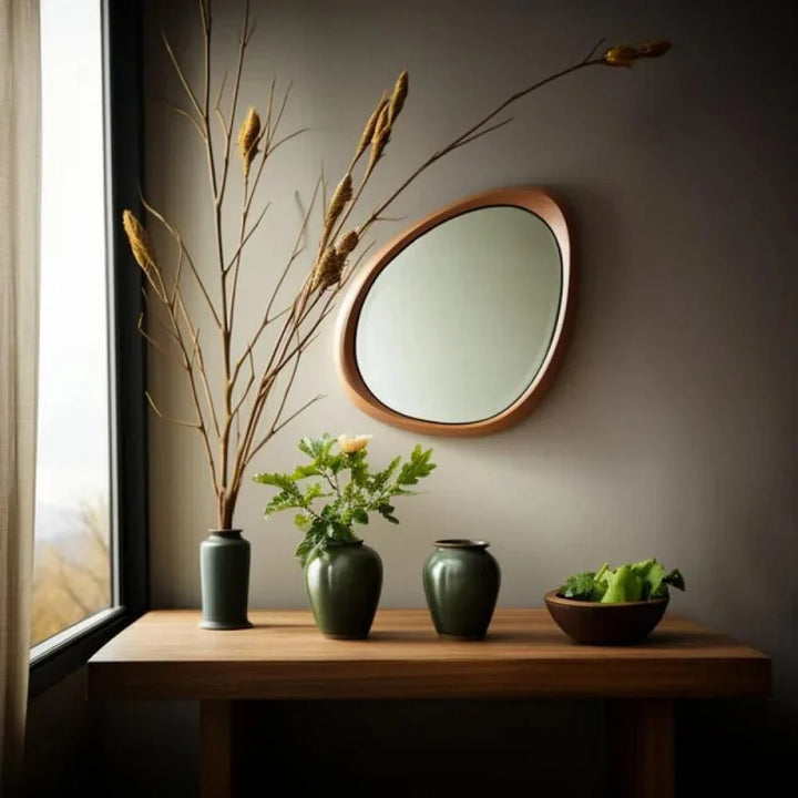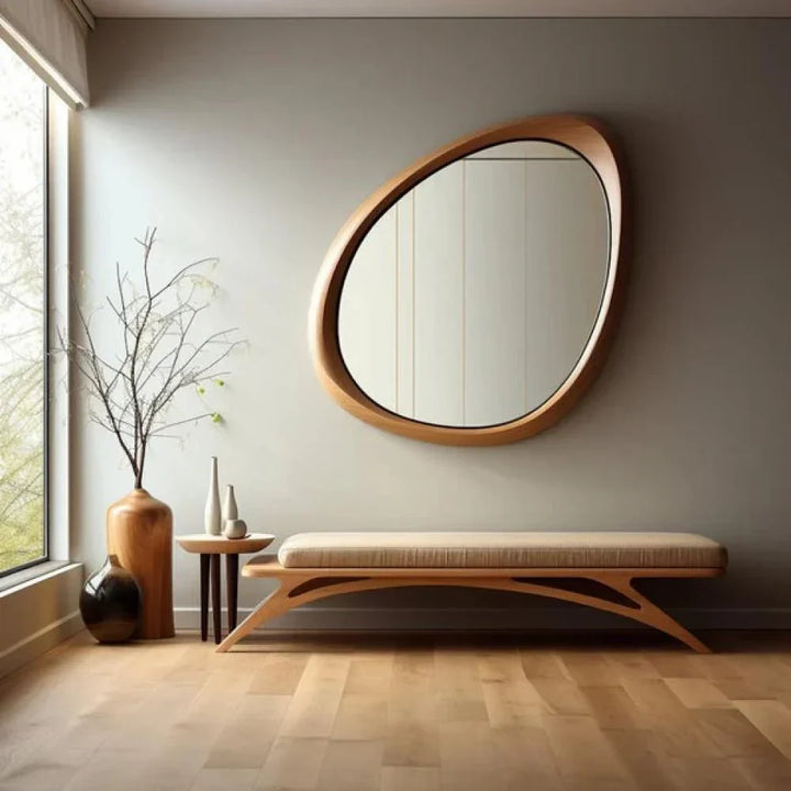 ارفع من مستوى ديكور منزلك مع هذه المرأة الفنية التي تتجاوز حدود التصميم التقليدي. إطارها الخشبي الأنيق يمنحها شكلاً انسيابيًا، مما يجعلها قطعة فنية آسرة ومركز اهتمام في أي غرفة. إنها ليست مجرد مرآة، بل تحفة فنية مصممة لتكون انعكاسًا لذوقك الرفيع