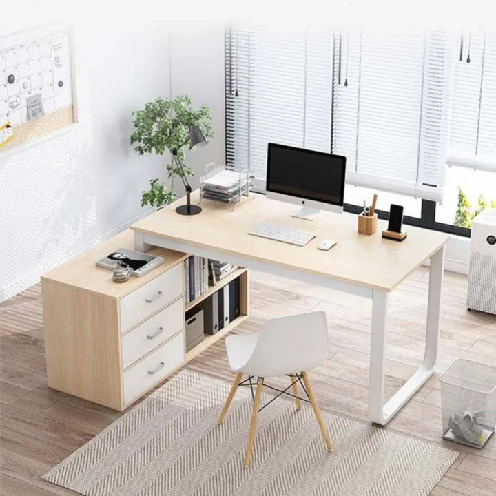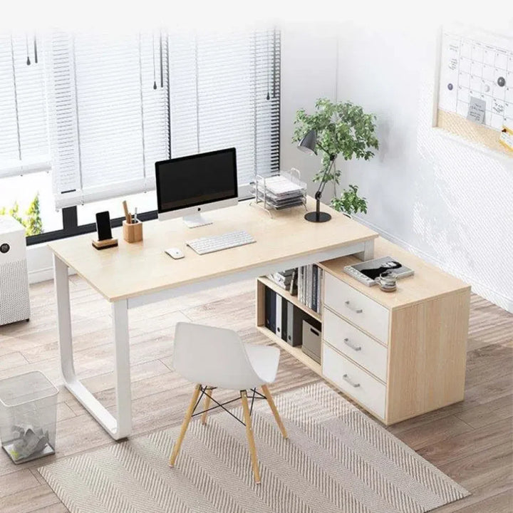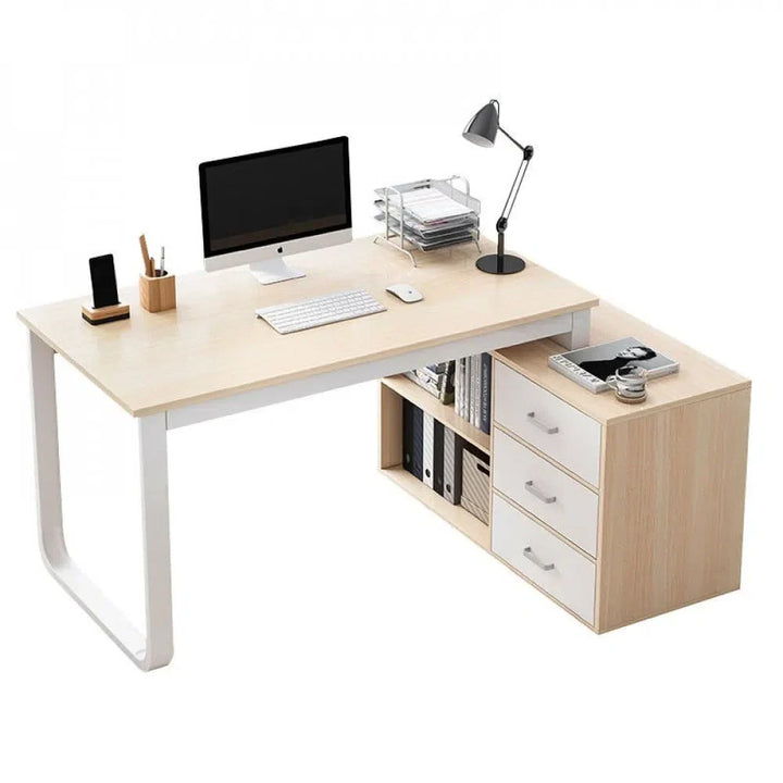 مكتب خشبي جانبي فاخر على شكل L .مصنوع من الخشب MDF عالي الجودة + هيكل من الفولاذ .يحتوي على وحدة ادراج جانبية مع ارفف لتوفير مساحة تخزين كبيرة . مزود بمقابض من الالومنيوم + ارجل من الستيل المتين . ومتاح ب اللون الخشبي الفاتح و مقاسات ( العمق 80/100 سم * العرض 120/140 سم / الارتفاع 75 سم )