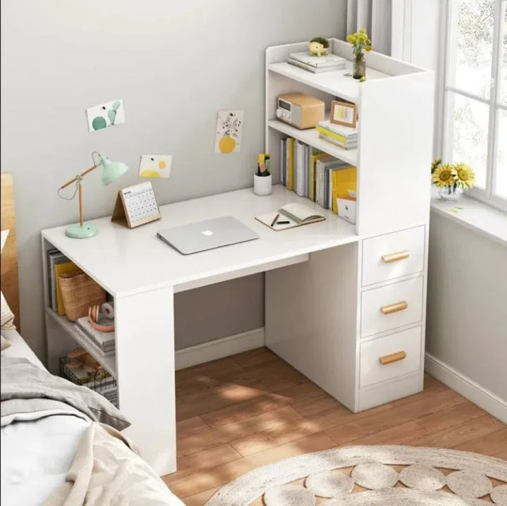 يأتي مع خزانة تحتوي على مكتبة وأرفف متعددة و 3 ادراج لمزيد من مساحات التخزين . و متوفر ب الوان ( ابيض - خشبي * ابيض )