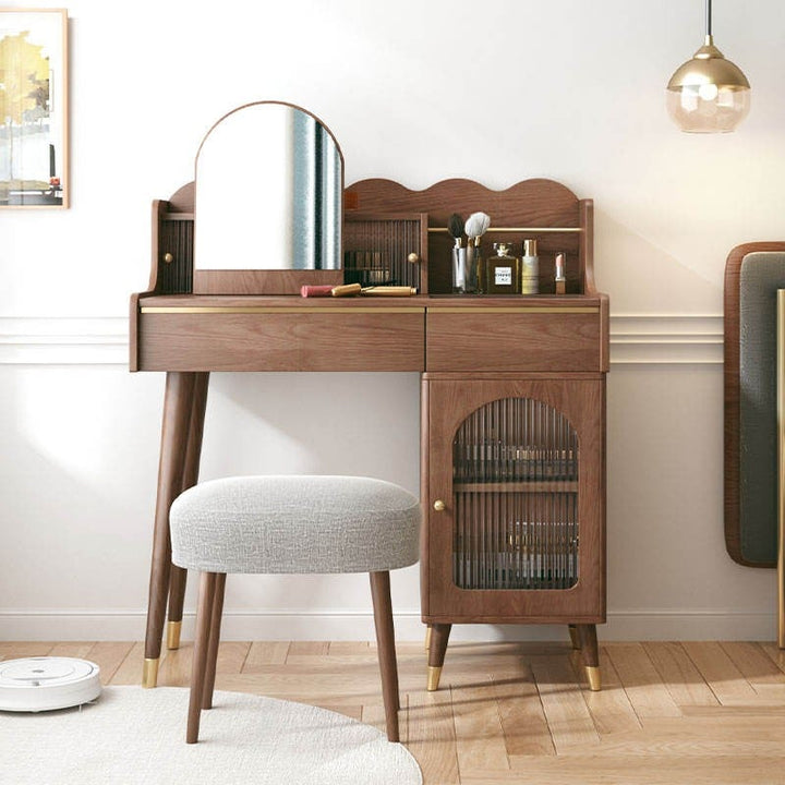 احصلي على تسريحة لغرفة النوم بتصميم كلاسيكي رائع وتوفره بلون بني دافئ يلائم جميع الاثاث في منزلك . متوفرة هذه التسريحة بمقاس مثالي وهو عرض 150سم وارتفاع 95سم وعمق 50سم , تم تصميم هذه التسريحة بأجود الخامات، فهي مصنوعة من أجود أنواع الخشب (MDF) والزجاج لتحافظ على جودتها وتدوم طويلاً